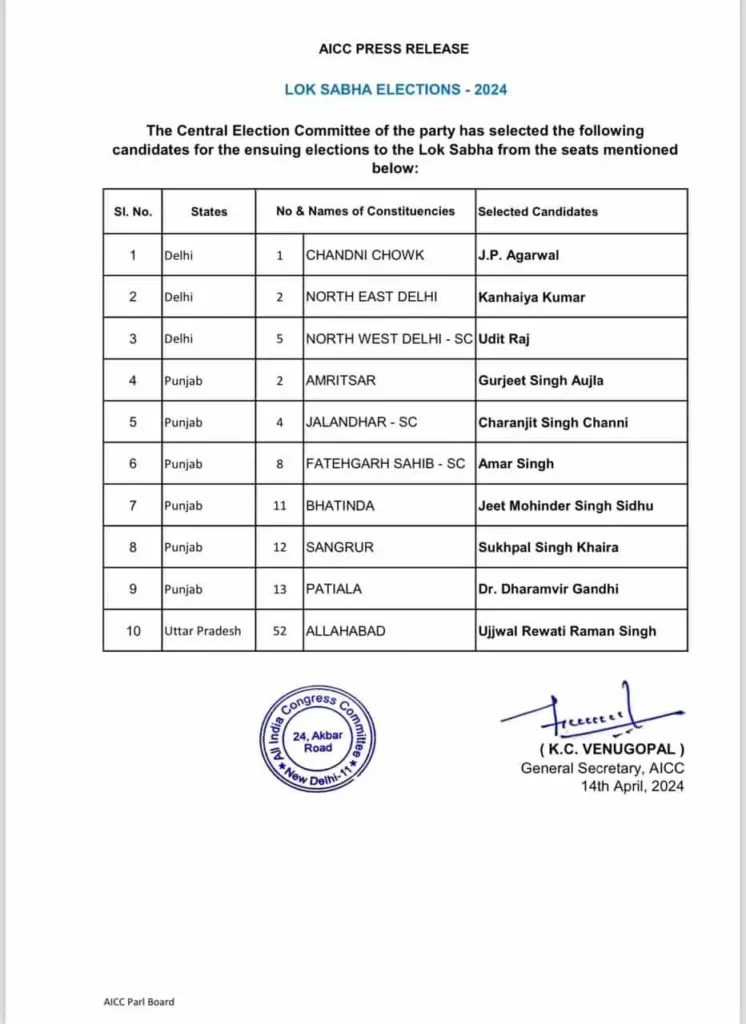 नई दिल्ली: कांग्रेस ने आम चुनाव के लिए 10 उम्मीदवारों की एक और सूची जारी की है. जिसमें जेएनयू स्टूडेंट्स यूनियन के पूर्व अध्यक्ष कन्हैया कुमार को उत्तर पूर्वी दिल्ली से उम्मीदवार बनाया है. कन्हैया भाजपा के उत्तर पूर्वी दिल्ली के उम्मीदवार मनोज तिवारी के खिलाफ चुनाव लडेंगे. वहीं कांग्रेस ने जे.पी. अग्रवाल को चांदनी चौक से प्रत्याशी बनाया है. वह भाजपा उम्मीदवार प्रवीण खंडेलवाल के खिलाफ चुनाव लडेंगे. उदित राज को उत्तर-पश्चिम दिल्ली से टिकट दिया गया है और वह योगेंद्र चंदोलिया के खिलाफ चुनावी मैदान में होंगे.