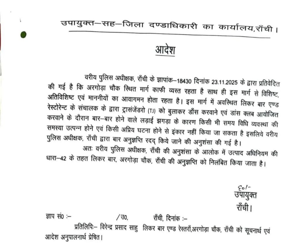 Ranchi : यह कदम रांची एसएसपी राकेश रंजन के अनुशंसा के आधार पर उठाया गया। अरगोड़ा चौक स्थित एक लिकर बार में बार-बार हो रहे विवाद और मारपीट के मामलों को गंभीरता से लेते हुए रांची डीसी मंजूनाथ भजंत्री ने बार का लाइसेंस सस्पेंड कर दी है।